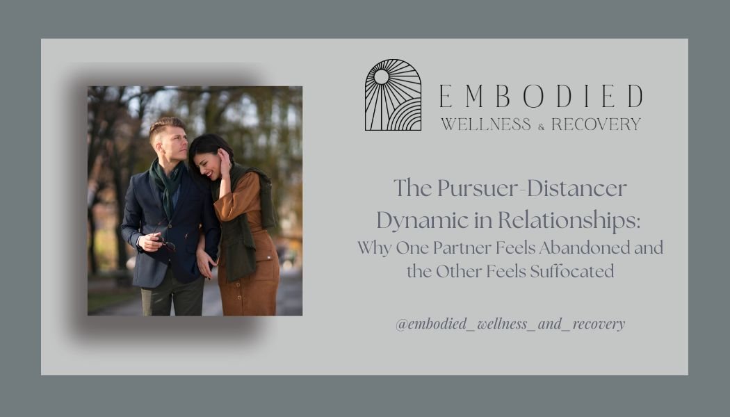 At Embodied Wellness and Recovery, we specialize in helping couples untangle patterns like the pursuer-distancer dynamic. By integrating neuroscience, somatic therapy, EMDR, and relational coaching, we guide partners in learning how to regulate their nervous systems, honor their differences, and cultivate deeper intimacy and connection.